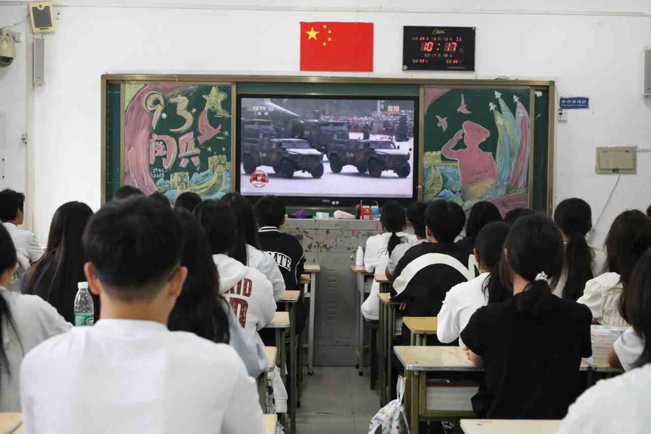 随着国歌奏响,升旗仪式开始,全体师生起立并行注目礼,将阅兵现场的庄严与力量,转化为集体的精神共鸣。阅兵仪式中,徒步方队的铿锵步伐、装备方队的钢铁洪流、空中梯队的飒爽英姿,让师生们深刻感受到祖国国防力量的日益强大,令在场师生深受触动。直播结束后,不少学生难掩激动的心情,纷纷表示要努力学习技能本领,将来为祖国的发展贡献自己的一份力量。