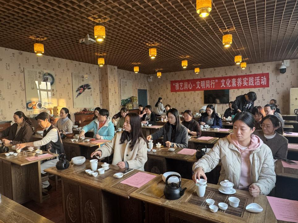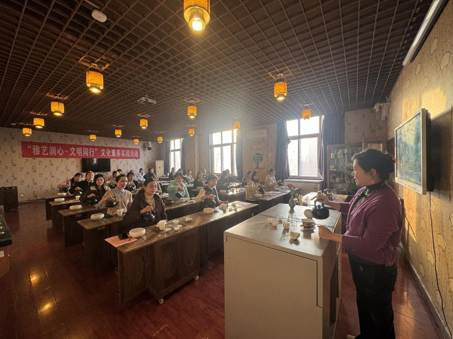 在实训楼茶艺实训室里,职工们跟着专业课茶艺课程任和老师学习温杯、投茶、注水、出汤的标准动作,听茶叶分类知识,有人感慨:“以前觉得喝茶简单,现在才知道‘盖碗三指捏’里也有讲究,这就是中国茶的雅致。”