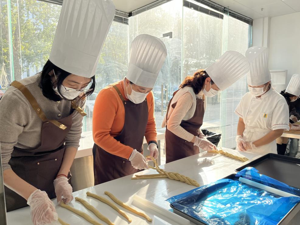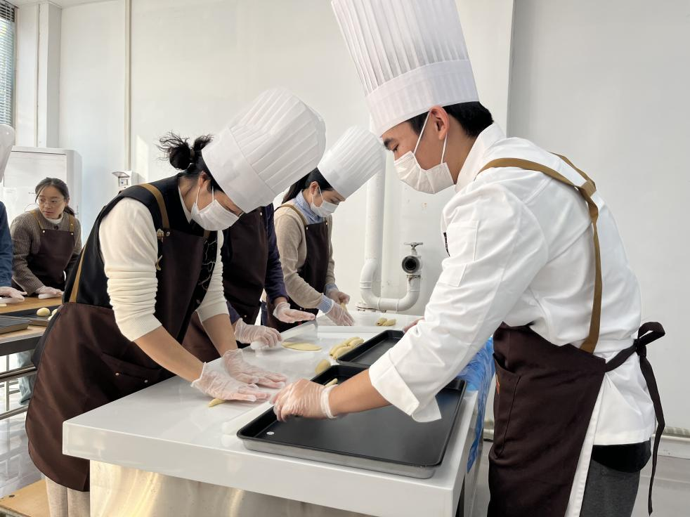 临中原路综合楼的烘焙实训室里,中西式面点专业教师轩辕宗翰带领职工们揉面、塑形、刷蛋液,亲手制作法式皇家面包布里欧修,刚出炉的面包香气飘满走廊,成为当天最“治愈”的风景线。