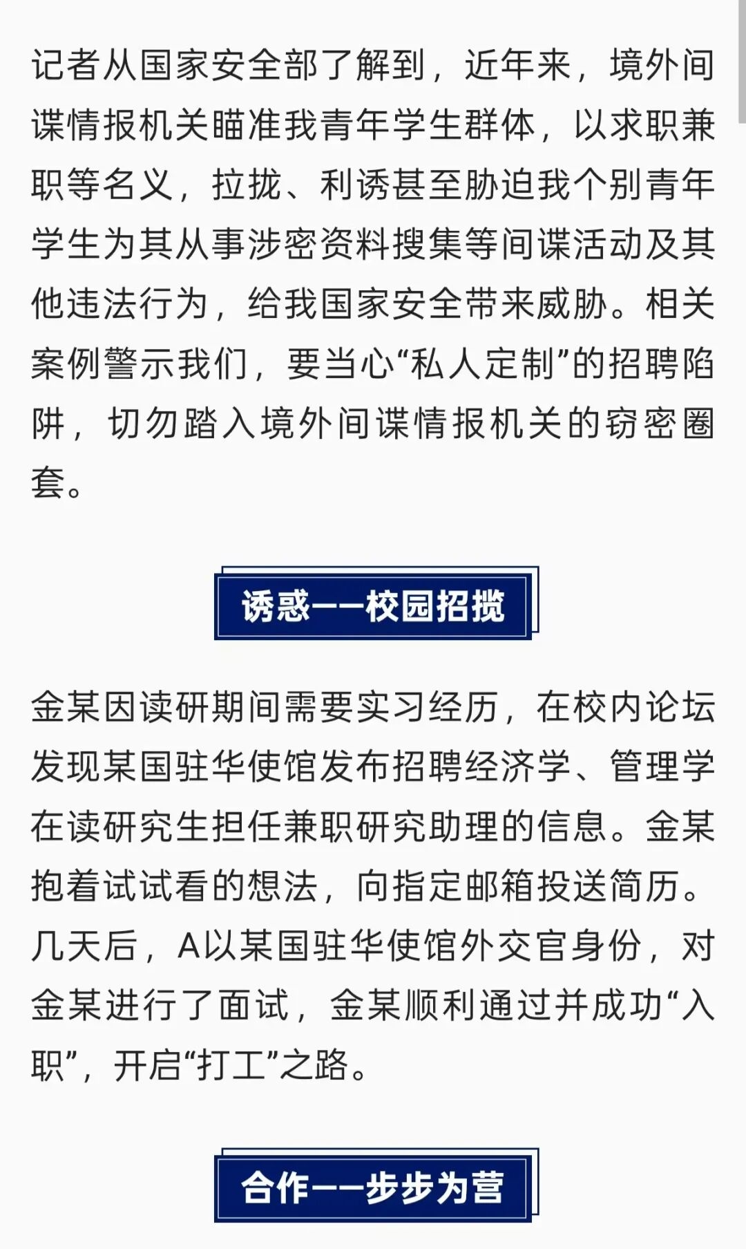 平安校园 | 境外间谍以兼职为名,拉拢、利诱甚至胁迫我青年学生搜集敏感数据、撰写报告,国安机关披露案件详情